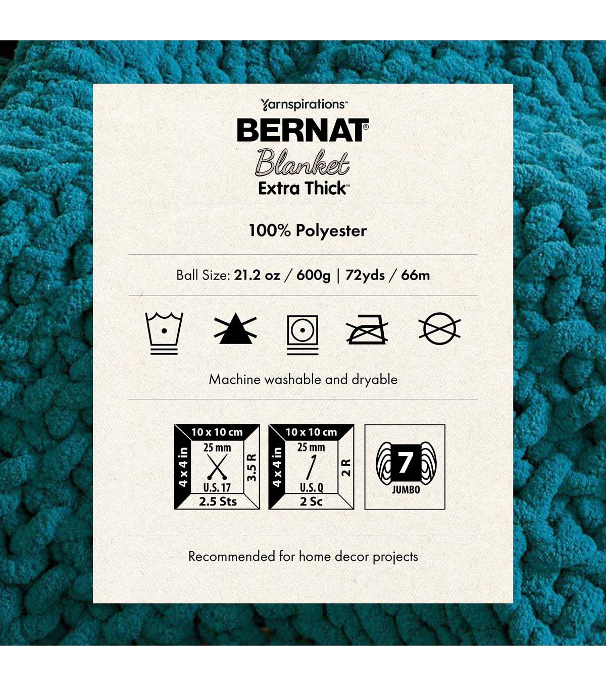 Extra Extra! Bernat Extra Thick yarn gets your project from start to finish extra fast. Your favorite chenille-style Bernat Blanket yarn now has even more to love. The jumbo weight comes in a generously sized ball so each one goes a long, long way. Use Bernat Blanket Extra Thick to stitch up washable, squishable, comfortable projects that are done before you know it.