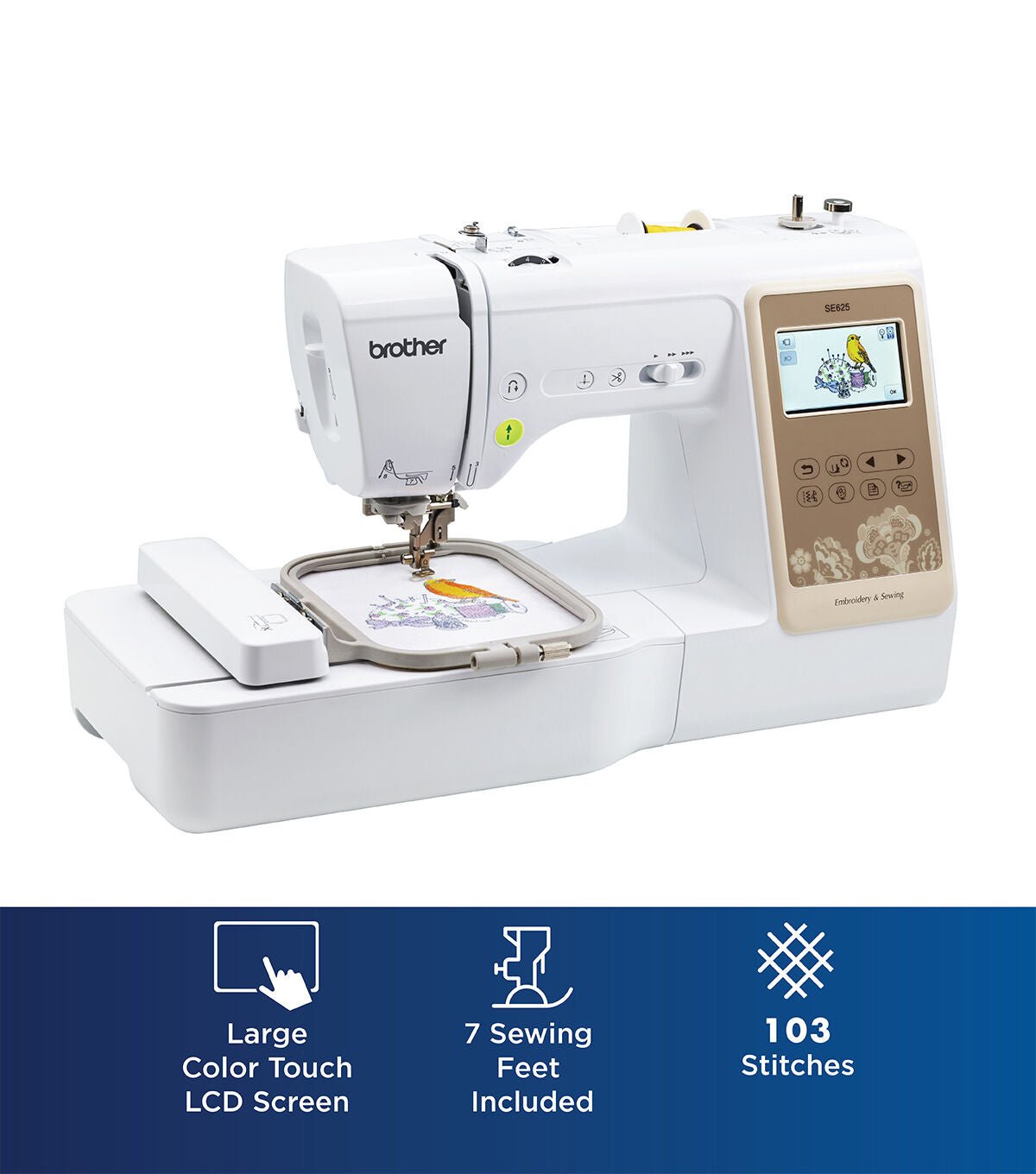 Bring your creative visions to life! The Brother SE625 2-in-1 sewing and 4 in x 4 in embroidery machine gives you more. More color with a large color LCD screen, more designs, more fonts, with more workspace and features for creative sewing. View your embroidery designs in full color on the large, 3.7 in Sew Smart color LCD touch screen display, and preview your design edits before stitching. With expanded embroidery design editing features, you can change individual thread colors, place lettering in an arc, move designs on the touch screen display with your fingertip, and much more. Choose from 280 fresh, inspiring embroidery designs built-in and on the included CD, or import your designs through the USB port for virtually unlimited design options. Sewing features include 103 versatile built-in sewing stitches, needle up/down and variable speed controls, and drop feed for creative free-motion sewing. The large 6.4 in W x 4.1 in H needle-to-arm workspace allows more room for folding quilts and bulkier projects to the right of the needle, for easier sewing. Included are seven quick-change sewing feet, with spring action zigzag, buttonhole, overcasting, monogramming, zipper, blind stitch, and button sewing feet. The spring action zigzag foot is designed with a longer foot, and, combined with the longer 7-point feed dogs, help provide smoother fabric feeding.