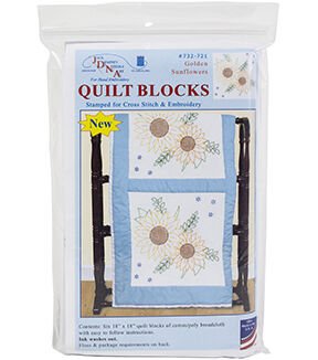 Create a beautiful quilt top using this great kit. It consists of individual squares to stitch and join together to form a quilt top. The stitching designs have been stamped using ink that washes away with any liquid and the fabric is a cotton/poly blend broadcloth. This package contains six 18×18 inch quilt squares, instructions for completion and care and complete list of DMC floss requirements. Fabric, backing, needle, thread and floss all sold separately. Design: Golden Sunflowers. Made in USA.