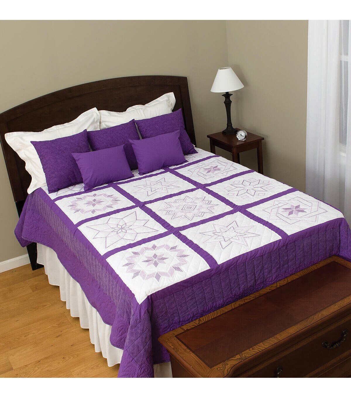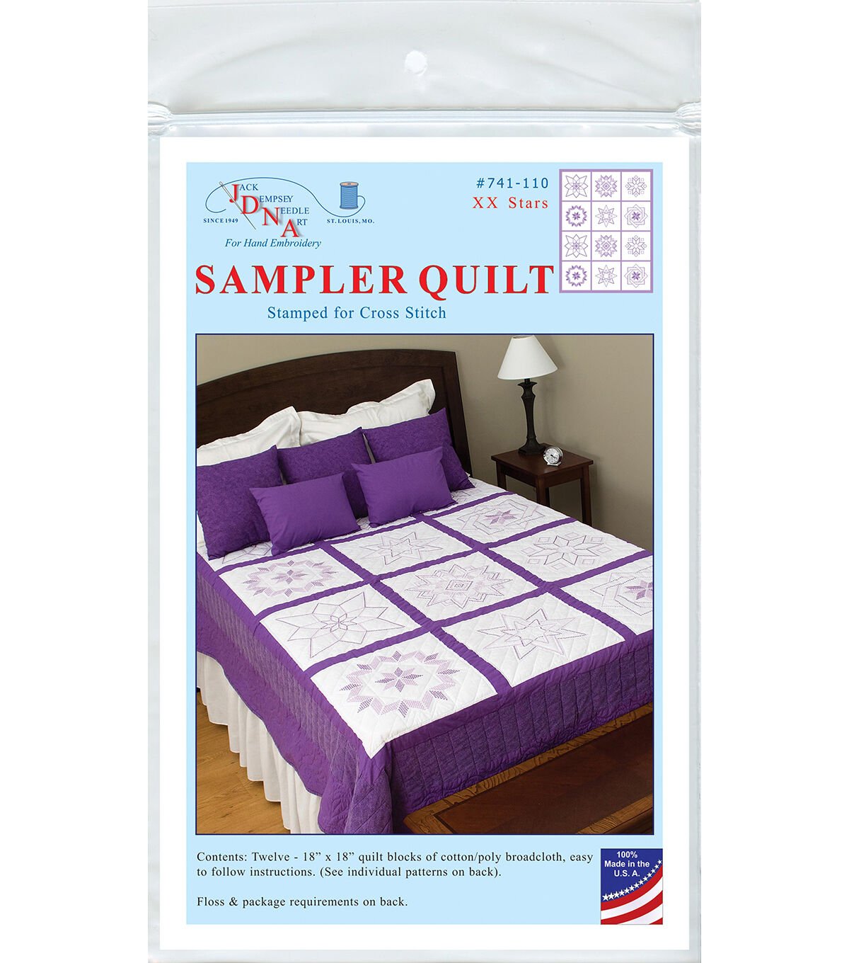 Create a beautiful quilt top using this great kit. It consists of individual squares to stitch and join together to form a quilt top. The stitching designs have been stamped using ink that washes away with any liquid and the fabric is a cotton/poly blend broadcloth. This package contains twelve 18×18 inch quilt squares, instructions for completion and care and complete list of DMC floss requirements. Fabric, backing, needle, thread and floss all sold separately. Design: XX Stars. Made in USA.
