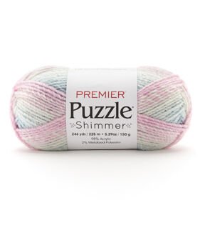 The newest addition to the Puzzle family, Puzzle Shimmer has the color you love with a subtle shimmer, a yarn in spectacular colors. Each ball is crafted with 4 coordinating colors that combine to create ever-changing, softly blended stripes plied. Weight Category: 5. Content: 98% Acrylic, 2% Metalized Polyester. Put up: 5.29oz/150g, 246yds/225m. Gauge: 15sx20r=4in/10cm on size US Size 10 (6 mm) knitting needles. Suggested crochet hook size: US Size J-10 (6 mm). Dyelotted: we try but are not always able to match dyelots. Available in a variety of colors. Each sold separately. Machine Wash Cold, Do Not Bleach, Do Not Tumble Dry, Do Not Iron, Dry Clean with Solvents. Imported.